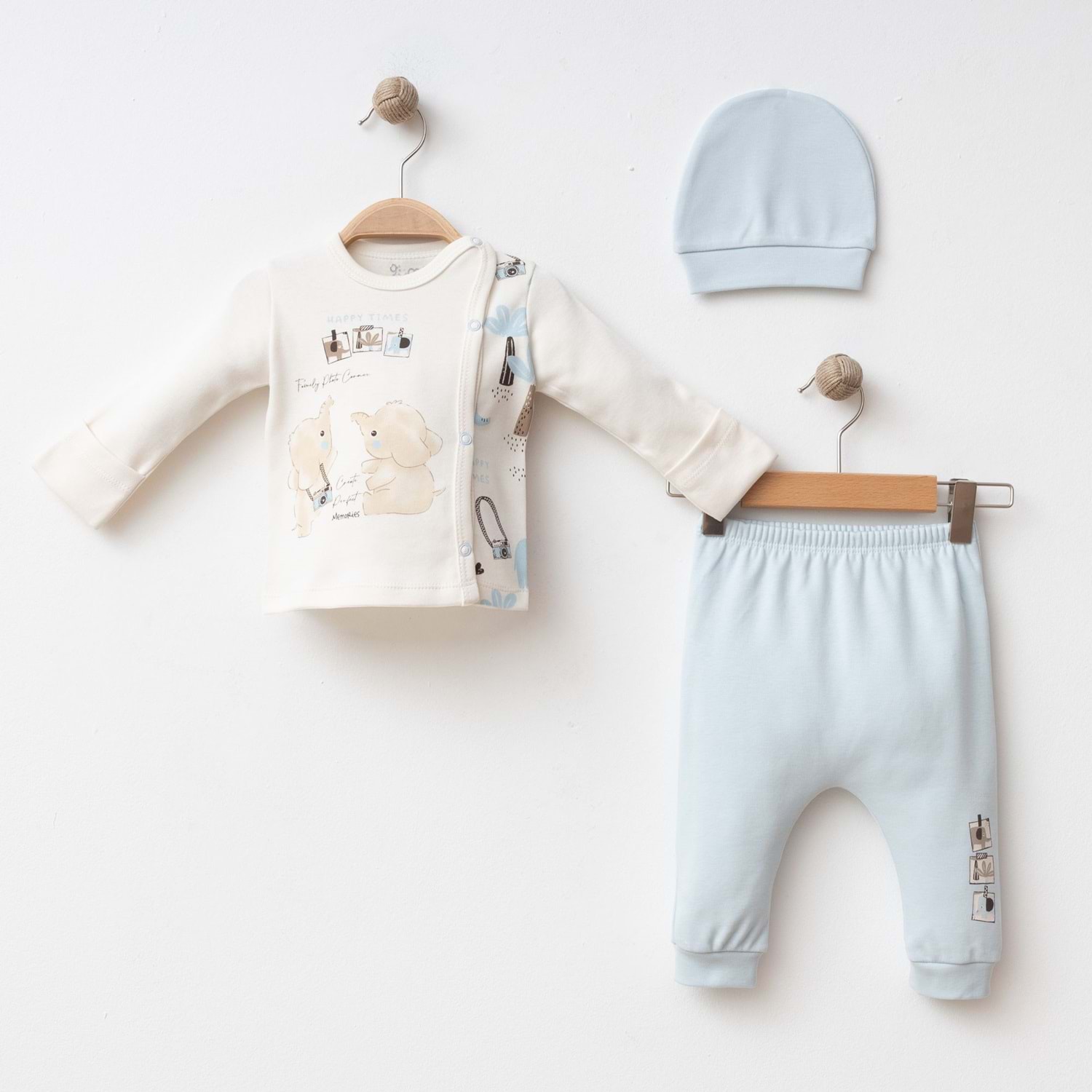 Erkek bebeklere özel mavi & ekru renk kombinasyonu