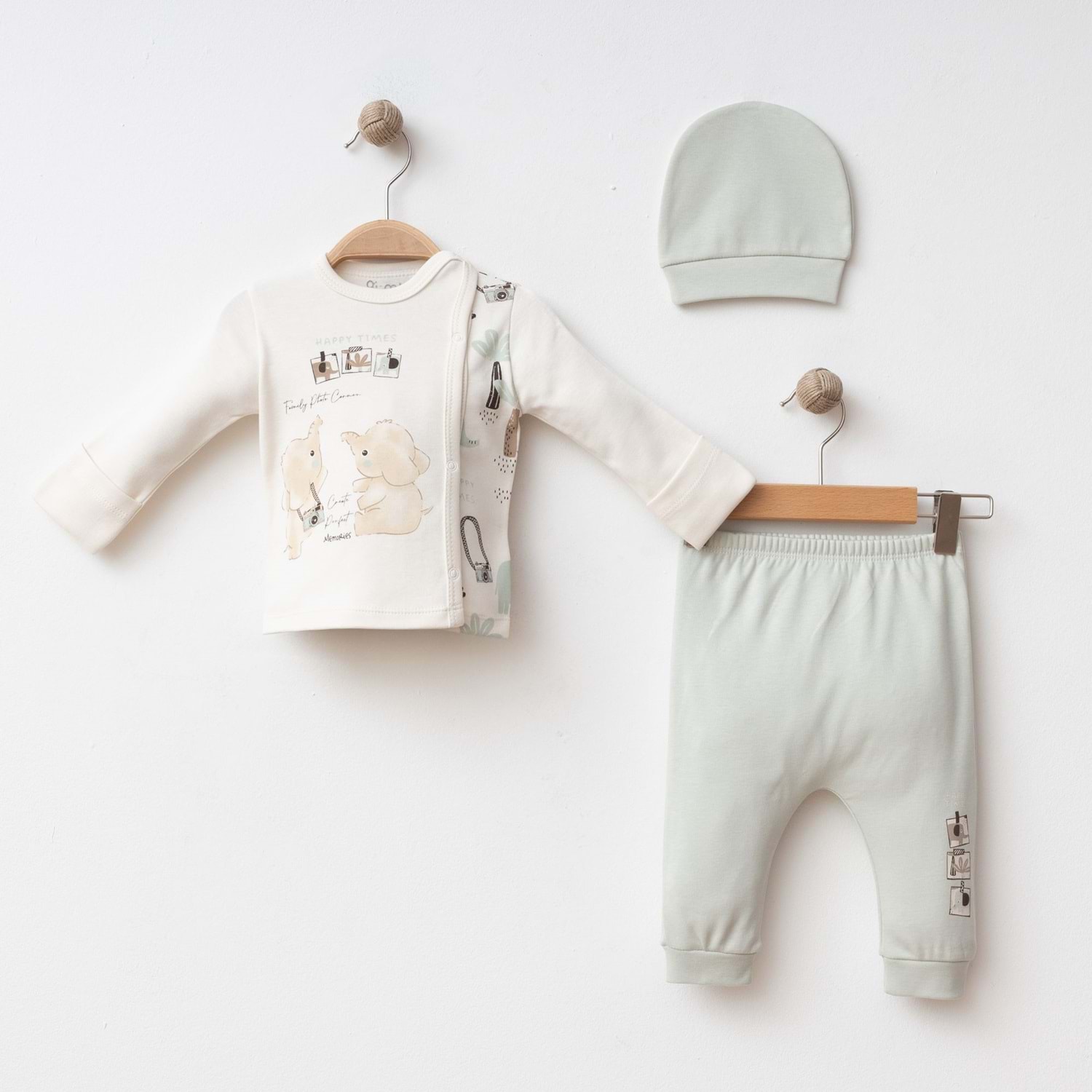 3’lü set: Çıtçıtlı uzun kollu üst, pantolon ve şapka
