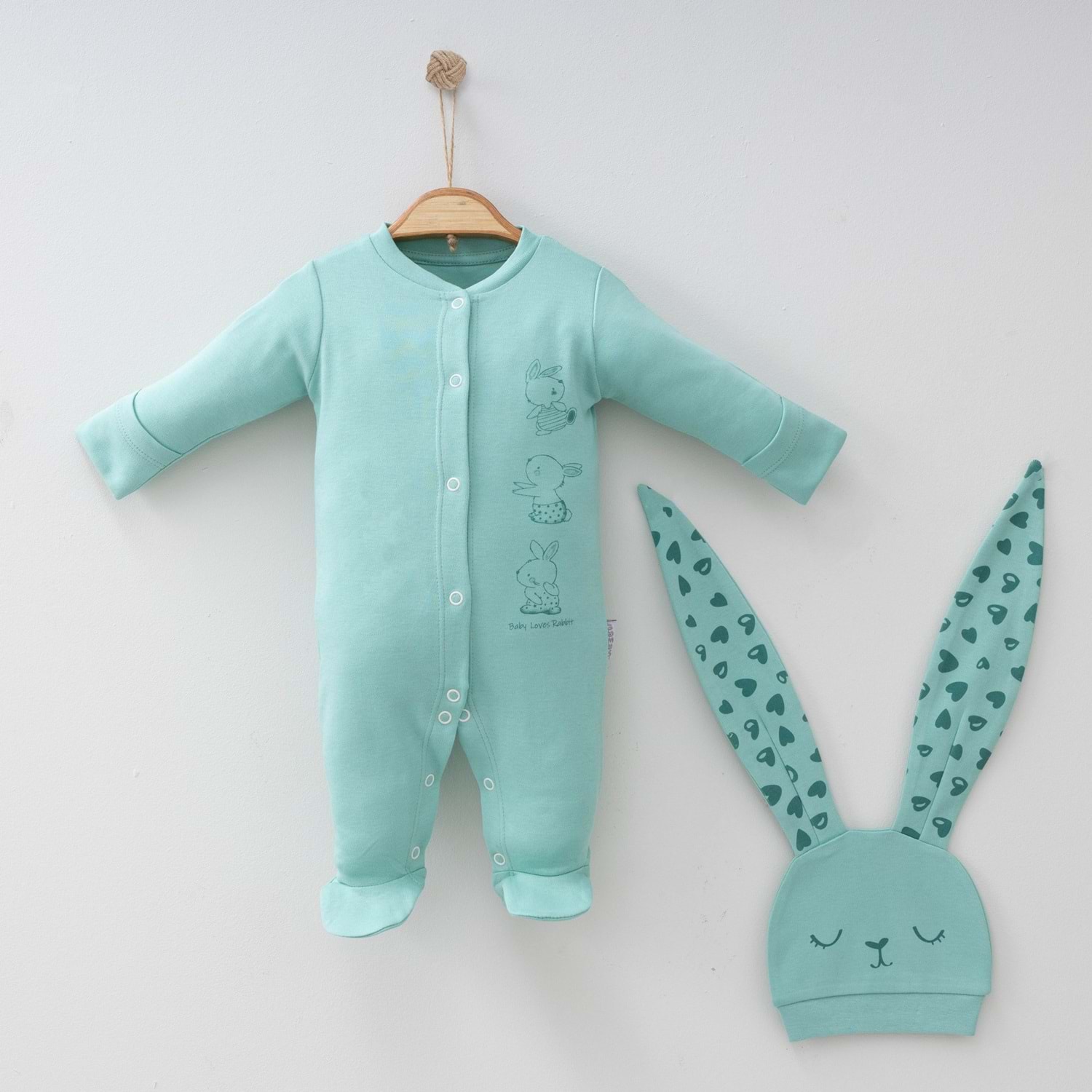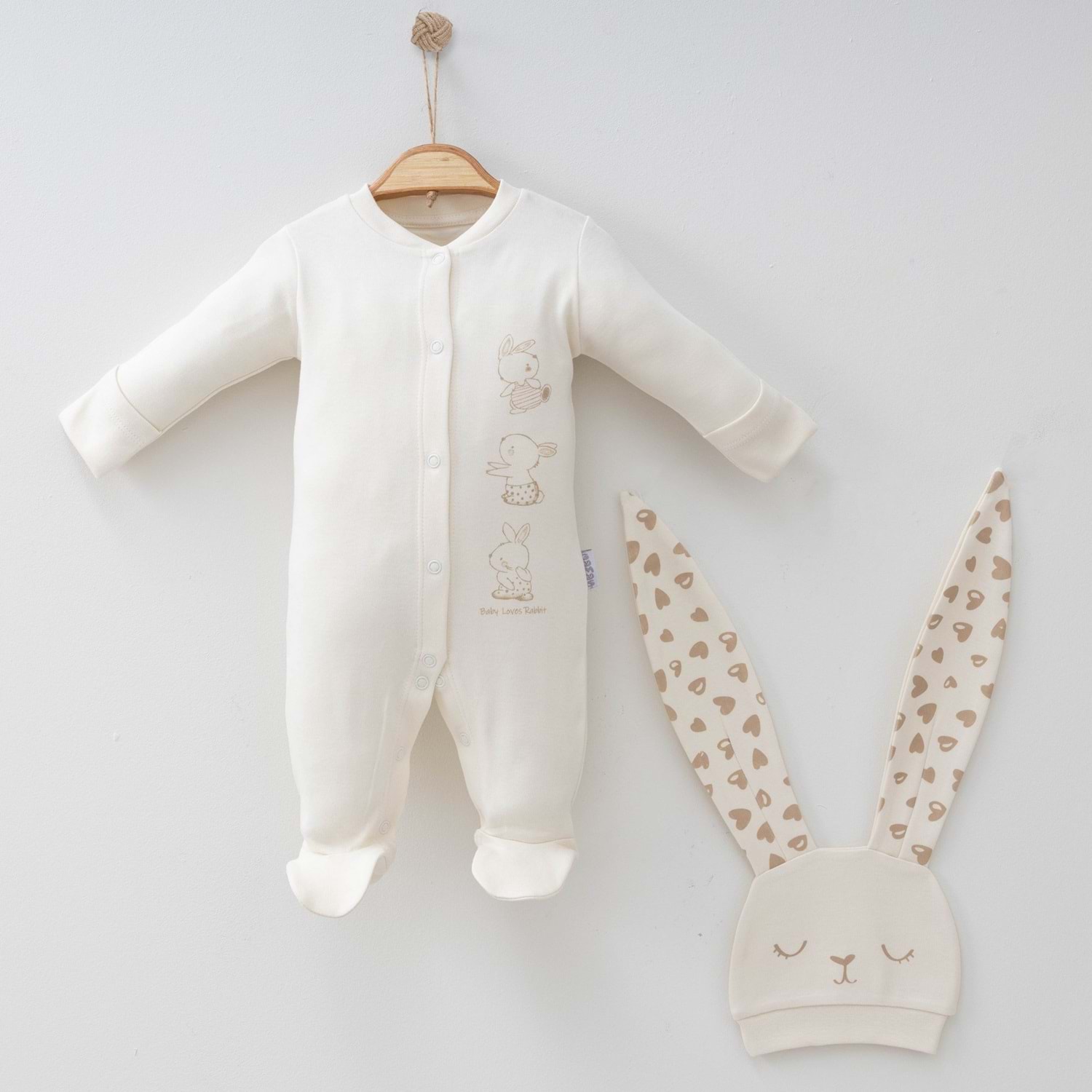 Doğal rengi, yumuşak pamuklu kumaşı ve sevimli detaylarıyla bu ekru tavşan desenli bebek tulumu ve şapka seti, bebeğiniz için sağlıklı, şık ve güvenli bir seçimdir
